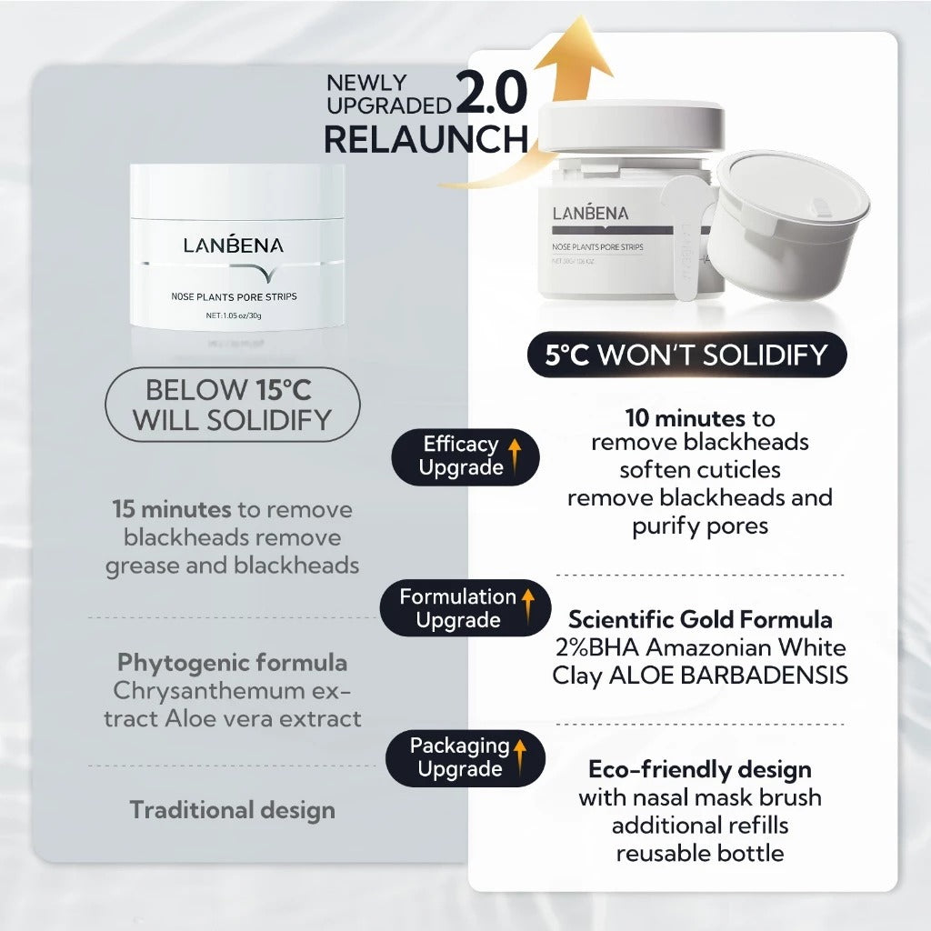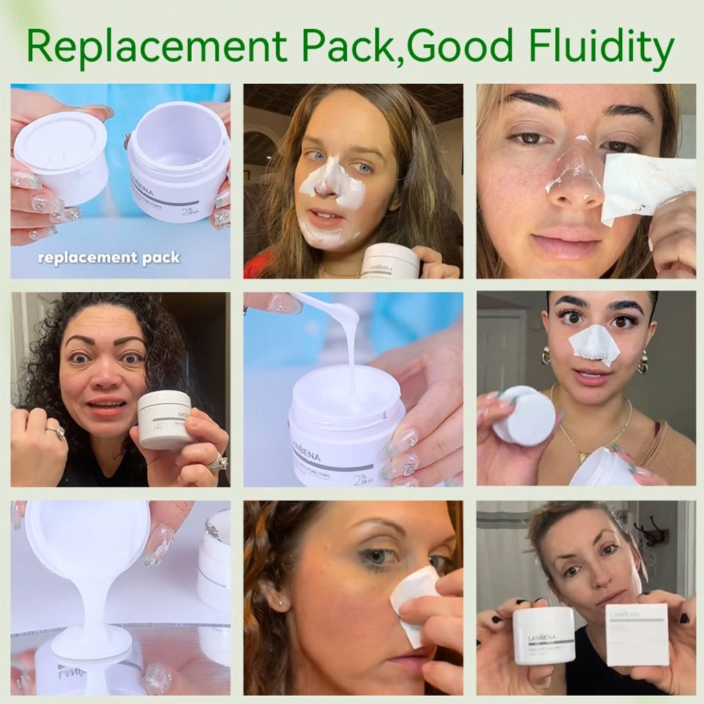 The LANBENA Blackhead Remover Mask is a deep-cleansing facial peeling mask designed to eliminate blackheads, whiteheads, and excess oil while soothing and repairing the skin. Infused with 2% BHA, Amazonian White Clay, Aloe Vera, and Hyaluronic Acid, it effectively unclogs pores, regulates oil secretion, and hydrates the skin. The upgraded eco-friendly packaging allows for refillable use, promoting sustainability. Suitable for sensitive skin, this mask gently dissolves blackheads, removes dead skin cells, and leaves the skin feeling smooth, refreshed, and clear.