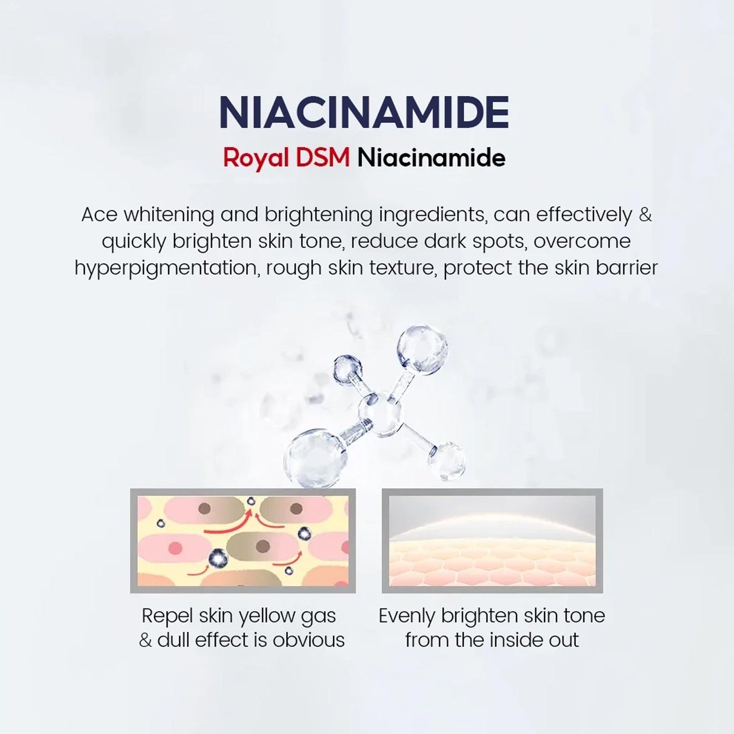 Added 2% of the world's best nicotinamide---Royal DSM nicotinamide, ace whitening and brightening ingredients, the concentration of the serum level reached 99.6%, the same as the nicotinamide in SKU-II, but also with a very strong whitening ingredients: 5X ceramide, Arbutin, Rice Ferment Filtrate, Vitamin C imported from Japan, Bifida Ferment Filtrate to inhibit the formation of melanin and quickly brighten, improve dull and rough skin, relieve and repair, replenish the lost moisture and nutrition for the skin, leaving the skin delicate and clear, tender and lubricated.